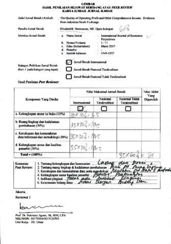 Elizabeth Sugiarto D, review and MF. Djeni Indrajati, review (2017) Reviewer Jurnal B.15 Elizabeth S. Dermawan, MF. Djeni Indrajati. The Quality of Operating Profit and Other Comprehensive Income : Evidence from indonesia Stock Exchange, 11 (1). pp. 1545-1557. ISSN 1307-1637