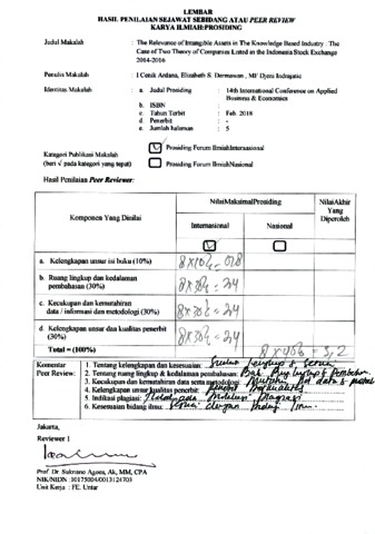 Elizabeth, Elizabeth and I Cenik Ardana, reviewer and MF. Djeni Indrajati, review (2018) Reviewer Prosiding B.21 I Cenik Ardana, Elizabeth S. Dermawan , MF Djeni Indrajatic. The Relevance of Intangible Assets in The Knowledge Based Industry : The Case of Two Theory of Companies Listed in the Indonesia Stock Exchange 2014-2016.