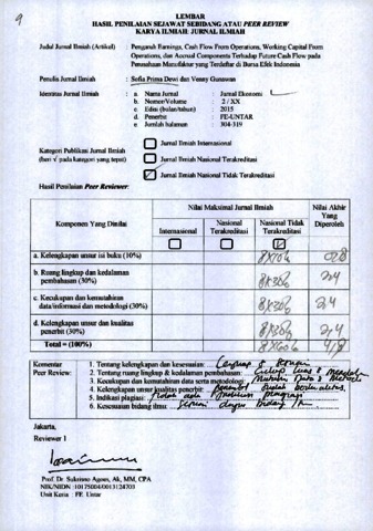 Sofia Prima Dewi, Review and Venny Gunawan, Review (2015) Reviewer Jurnal B.9 Sofia Prima Dewi dan Venny Gunawan. Pengaruh Earnings, Cash Flow From Operations, Working Capital From Operations, dan Accrual Components Terhadap Future Cash Flow pada Perusahaan Manufaktur yang Terdaftar di Bursa Efek Indonesia, XX (2). pp. 304-319. ISSN 0854-9842