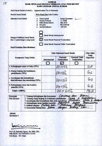 Sofia Prima Dewi, Review and Cynthia, Review (2018) Reviewer Jurnal B.15 Sofia Prima Dewi dan Cynthia. Aggresiveness Tax in Indonesia, XXII (2). pp. 239-254. ISSN 1410-3591