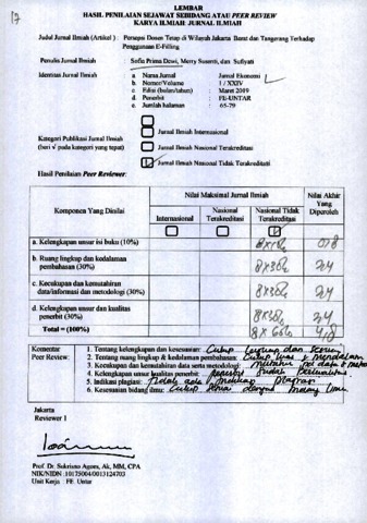 Sofia Prima Dewi, Review and Merry Susanti, Review and Sufiyati, Review (2019) Reviewer Jurnal B.17 Sofia Prima Dewi, Merry Susanti, dan Sufiyati. Persepsi Dosen Tetap di Wilayah Jakarta Barat dan Tangerang Terhadap Penggunaan E-Filling, XXIV (1). pp. 65-79. ISSN 0854-9842