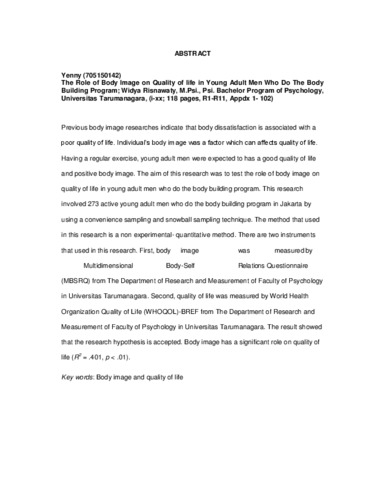 Yenny, Yenny (2020) Peran Citra Tubuh terhadap Kualitas Hidup pada Pria Dewasa Awal yang Melakukan Program Pembentukan Tubuh. Skripsi thesis, Universitas Tarumanagara.