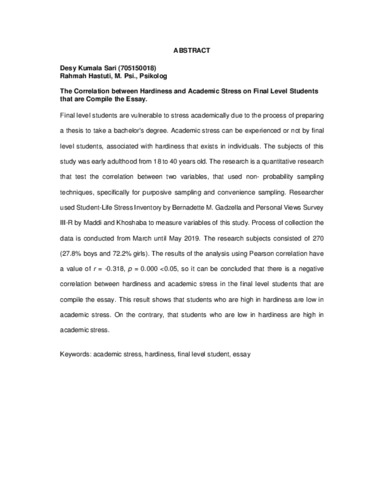 Final level students are vulnerable to stress academically due to the process of preparing a thesis to take a bachelor's degree. Academic stress can be experienced or not by final level students, associated with hardiness that exists in individuals. The subjects of this study was early adulthood from 18 to 40 years old. The research is a quantitative research that test the correlation between two variables, that used non- probability sampling techniques, specifically for purposive sampling and convenience sampling. Researcher used Student-Life Stress Inventory by Bernadette M. Gadzella and Personal Views Survey III-R by Maddi and Khoshaba to measure variables of this study. Process of collection the data is conducted from March until May 2019. The research subjects consisted of 270 (27.8% boys and 72.2% girls). The results of the analysis using Pearson correlation have a value of r = -0.318, p = 0.000 <0.05, so it can be concluded that there is a negative correlation between hardiness and academic stress in the final level students that are compile the essay. This result shows that students who are high in hardiness are low in academic stress. On the contrary, that students who are low in hardiness are high in academic stress.