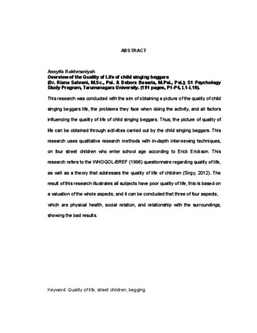Rakhmaniyah, Assyifa (2020) Gambaran Kualitas Hidup Anak Jalanan yang Mengamen. Skripsi thesis, Universitas Tarumanagara.