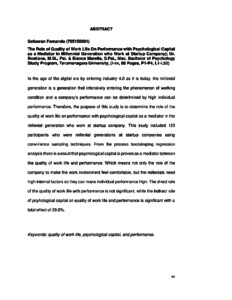 Fernando, Setiawan (2020) Peran Kualitas kehidupan kerja terhadap kinerja dengan modal Psikologis sebagai mediator pada generasi Milenial yang Bekerja di Perusahaan Startup. Skripsi thesis, Universitas Tarumanagara.