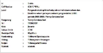 Cendana Sari, Yenny (2010) Pengaruh stock split terhadap abnormal return saham dan likuiditas saham pada perusahaan yang terdaftar di BEI periode 2006-2008. Skripsi thesis, Universitas Tarumanagara.