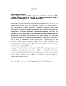 Pratiwi, Febby (2020) Hubungan Antara Kualitas Kehidupan Sekolah dengan Prokrastinasi Akademik Pada Pelajar SMA X Jakarta. Skripsi thesis, Universitas Tarumanagara.