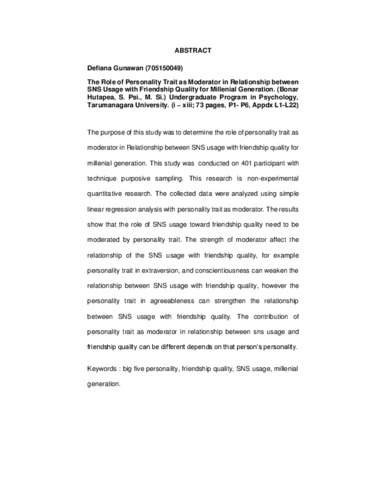 Gunawan, Defiana (2020) Peran Trait Kepribadian Sebagai Moderator dalam Hubungan Penggunaan Situs Jejaring Sosial dengan Kualitas Persahabatan Kaum Milenial. Skripsi thesis, Universitas Tarumanagara.