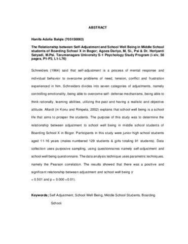 Adelia Balqis, Hanifa (2020) Hubungan antara Penyesuaian Diri dengan School Well Being pada siswa SMP Boarding School X di Bogor. Skripsi thesis, Universitas Tarumanagara.