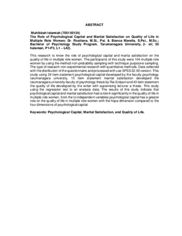 Islamiah, Muhibbah (2020) Peran Modal Psikologis dan Kepuasan Pernikahan Terhadap Kualitas Hidup pada Wanita Berperan Ganda. Skripsi thesis, Universitas Tarumanagara.