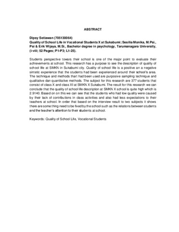 Setiawan, Dipsy (2020) Gambaran Kualitas Kehidupan Sekolah Pada Siswa SMK X di Sukabumi;. Skripsi thesis, Universitas Tarumanagara.