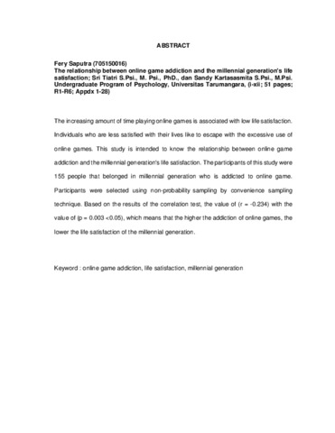 Saputra, Fery (2020) Hubungan Antara Kecanduan Game Online terhadap Kepuasan Hidup Generasi Millennial. Skripsi thesis, Universitas Tarumanagara.