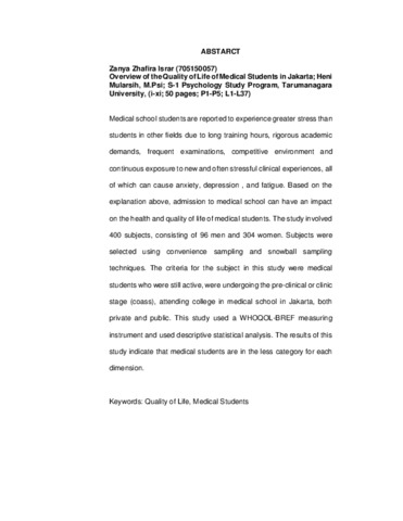 Zhafira Israr, Zanya (2020) Gambaran Kualitas Hidup Mahasiswa Kedokteran di Jakarta. Skripsi thesis, Universitas Tarumanagara.