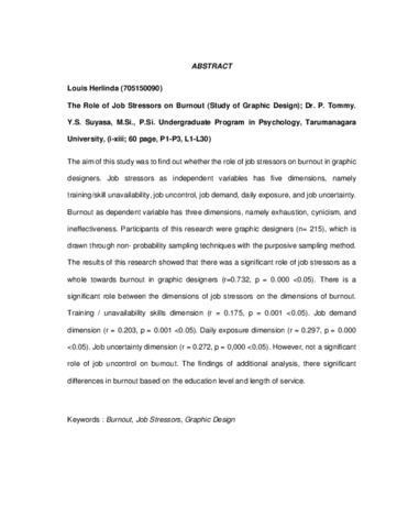 Herlinda, Louis (2020) Peran Sumber-sumber Stres Kerja terhadap Burnout (Studi pada Desainer Grafis);. Skripsi thesis, Universitas Tarumanagara.