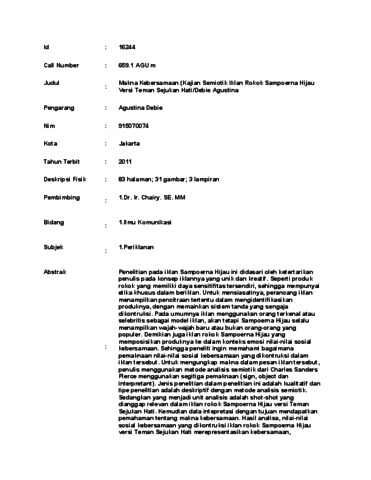 Agustina, Debie (2011) Makna Kebersamaan (Kajian Semiotik Iklan Rokok Sampoerna Hijau Versi Teman Sejukan Hati. Skripsi thesis, Universitas Tarumanagara.