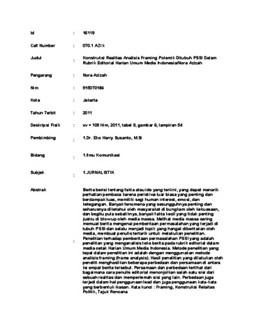 Azizah, Nora (2011) Konstruksi Realitas Analisis Framing Polemik Ditubuh PSSI Dalam Rubrik Editorial Harian Umum Media Indonesia. Skripsi thesis, Universitas Tarumanagara.
