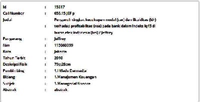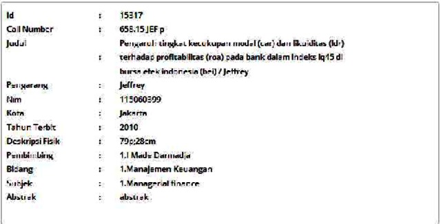 Jeffrey, Jeffrey (2010) Pengaruh tingkat kecukupan modal (car) dan likuiditas (ldr) terhadap profitabilitas (roa) pada bank dalam indeks lq45 di bursa efek indonesia (bei). Skripsi thesis, Universitas Tarumanagara.