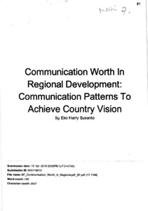 Susanto, Eko Harry (2014) Communication Worth in Regional Development: Communication Patterns to Achieve Country Vision. The Journal of Development Communication, 25 (1-2). pp. 26-44. ISSN 0128-3863