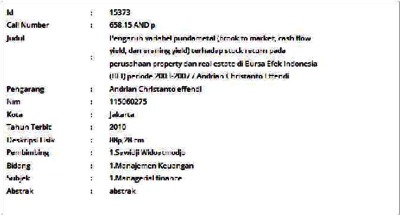 Christanto Effendi, Andrian (2010) Pengaruh variabel pundametal (brook to market, cash flow yield, dan eraning yield) terhadap stock return pada perusahaan property dan real estate di Bursa Efek Indonesia (BEI) periode 2003-2007. Skripsi thesis, Universitas Tarumanagara.