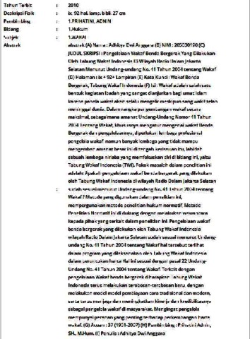 (A) Nama : Adhitya Dwi Anggara (B) NIM : 205030190 (C) JUDUL SKRIPSI : Pengelolaan Wakaf Benda Bergerak Yang Dilakukan Oleh Tabung Wakaf Indonesia Di Wilayah Radio Dalam Jakarta Selatan Menurut Undang-undang No. 41 Tahun 2004 tentang Wakaf (D) Halaman : ix + 92+ Lampiran (E) Kata Kunci : Wakaf Benda Bergerak, Tabung Wakaf Indonesia (F) Isi : Wakaf adalah salah satu bentuk kegiatan ibadah yang sangat dianjurkan bagi umat Islam karena pahala wakaf akan selalu mengalir meskipun sang wakif telah meninggal dunia. Dalam rangka pengembangan wakaf secara maksimal, sebagaimana amanat Undang-Undang Nomor 41 Tahun 2004 Tentang Wakaf, khususnya mengatur mengenai wakaf Benda Bergerak dan pengelolaannya, diperlukan lembaga profesional pengelola wakaf, namun banyak lembaga yang tidak mampu mengemban amanat besar ini di tengah kerisauan itu, lahirlah sebuah lembaga nirlaba yang memfokuskan diri di bidang ini, yaitu Tabung Wakaf Indonesia (TWI). Pokok masalah dalam penelitian ini adalah: Apakah pengelolaan wakaf benda bergerak yang dilakukan oleh Tabung Wakaf Indonesia di wilayah Radio Dalam Jakarta Selatan sudah sesuai menurut Undang-undang No. 41 Tahun 2004 tentang Wakaf ? Metode yang digunakan dalam penelitian ini, mempergunakan metode penelitian hukum normatif, Metode Penelitian Normatif ini di dukung dengan melakukan wawancara kepada pihak yang terkait dalam penelitian ini. Pengelolaan wakaf benda bergerak yang dilakukan oleh Tabung Wakaf Indonesia wilayah Radio Dalam Jakarta Selatan sudah sesuai menurut Undang-undang No. 41 Tahun 2004 tentang Wakaf hal tersebut terlihat dalam program yang dilaksanakan oleh Tabung Wakaf Indonesia dalam peruntukan harta Hal ini sesuai dengan pasal 22 Undang-Undang No. 41 Tahun 2004 tentang Wakaf. Terkait dengan pengelolaan Wakaf benda bergerak diharapkan Tabung Wakaf Indonesia terus melakukan terobosan-terobosan baru, dengan melakukan model-model pembiayaan cara tradisional dan modern, serta terus menjaga dan meningkatkan kinerja dan kredibilitasnya sebagai pengelola wakaf di masyarakat. Mengingat pengelola mempunyai peranan yang penting terhadap perkembangan harta wakaf. (G) Acuan : 37 (1951-2007) (H) Pembimbing : Prihatini Adnin, SH., M.Hum. (I) Penulis : Adhitya Dwi Anggara