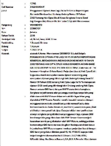 A.Nama : Wennienton/ 205060131 B.Judul Skripsi : PENGGUNAAN CIPTAAN ATAS LAGU YA YA YA UNTUK KEPENTINGAN KOMERSIAL BERDASARKAN UNDANG-UNDANG NOMOR 19 TAHUN 2002 TENTANG HAK CIPTA (STUDI KASUS SENGKETA ANTARA BAND GIGI DENGAN MVP PICTURE PH FILM TOILET 105) C.Halaman : vii + 96 halaman + lampiran D.Kata Kunci : Perjanjian Lisensi, Hak Cipta E.Isi : Lagu atau musik merupakan suatu ciptaan seseorang yang merupakan ciptaan yang dilindungi oleh Undang-Undang Pasal 12 Nomor 19 Tahun 2002 tentang Hak Cipta. Lagu Ya Ya Ya merupakan ciptaan GIGI band yang dilindungi oleh Undang-undang Hak Cipta. Namun antara GIGI band dengan MVP Picture timbul sengketa. Sengketa terjadi karena adanya penggunaan lagu tanpa izin yang dilakukan oleh MVP Picture dalam sebuah film layar lebar yang diproduksi MVP Picture. Penulis meneliti masalah tersebut dengan menggunakan metode penetilitian yuridis normatif yaitu data berdasarkan buku-buku literature, teori-teori, wawancara para pihak ahli hukum mengenai hak cipta. Data penelitian memperlihatkan adanya sengketa yang diakibatkan penggunaan lagu ciptaan GIGI band tanpa izin yang dilakukan oleh MVP Picture di mana terjadi kesalahan teknis yang dilakukan oleh MVP Picture, sehingga dalam komersialnya GIGI band merasa dirugikan Kesimpulan dalam kasus ini, sebaiknya MVP Picture segera membuat perjanjian lisensi dengan GIGI band yang diatur didalam pasal 45, 46, 47 UUHC supaya tidak terjadi sengketa dikemudian hari. F.Acuan : 27 ( 1986 2010 ) G.Pembimbing : Ibu Simona Bustani, S.H.,M.H. H.Penulis : Wennienton