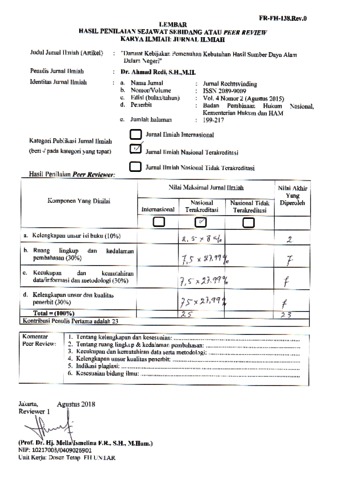 Redi, Ahmad (2015) Peer Review Darurat Kebijakan Pemenuhan Kebutuhan Hasil. BPHN.