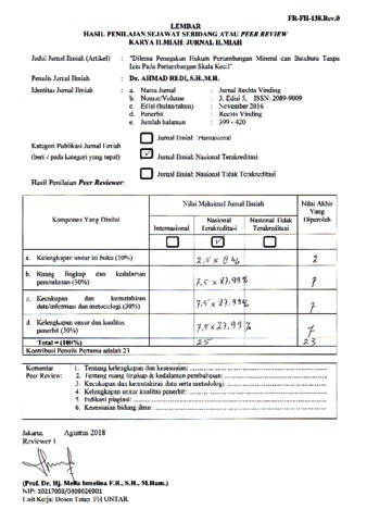 Redi, Ahmad (2016) Peer Review Dilema Penegakan Hukum Penambangan Mineral dan Batubara Tanpa Izin Pada Pertambangan Skala Kecil. Rechts Vinding.