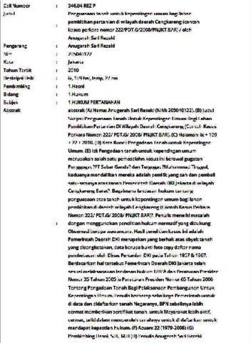 abstrak (A) Nama: Anugerah Sari Rezeki (NIM: 205040122). (B) Judul Skripsi: Penguasaan Tanah Untuk Kepentingan Umum Bagi Lahan Pembibitan Pertanian Di Wilayah Daerah Cengkareng (Contoh Kasus Perkara Nomor: 222/ PDT.G/ 2008/ PN.JKT.BAR). (C) Halaman: ix + 109 + 22 + 2010. (D) Kata Kunci: Pengadaan Tanah untuk Kepentingan Umum. (E) Isi: Pengadaan tanah untuk kepentingan umum merupakan salah satu pemasalahn kasus ini berawal gugatan Penggugat ?PT Sabar Ganda? dan Tergugat ?Muhammad Tinggul, keduanya mendalilkan mereka adalah pemilik yang sah dan pembeli satu-satunya atas tanah Pemerintah Daerah DKI Jakarta di wilayah Cengkareng Barat?. Bagaimana landasan hukum tentang penguasaan atas tanah untuk kepentingan umum bagi lahan pembibitan di daerah wilayah Cengkareng (Contoh Kasus Perkara Nomor: 222/ PDT.G/ 2008/ PN.JKT.BAR)?. Penulis meneliti masalah dengan menggunakan penelitian hukum normatif yang didukung Observasi berupa wawancara. Hasil penelitian kasus ini adalah Pemerintah Daerah DKI merupakan yang berhak atas obyek tanah yang disengketakan, data berupa bukti foto copy daftar nama pembebasan oleh Dinas Pertanian DKI pada Tahun 1957 & 1967. Berdasarkan hal tersebut Pemerintah Daerah DKI Jakarta telah sesuai melaksanakan landasan hukum UUPA dan Peraturan Presiden Nomor 35 Tahun 2005 jo Peraturan Presiden Nomor 65 Tahun 2006 Tentang Pengadaan Tanah Bagi Pelaksanaan Pembangunan Untuk Kepentingan Umum. Penulis berharap sebaiknya Pemerintah untuk di data dan didaftarkan tanah Negaranya, BPN sebaiknya lebih cermat memberikan sertifikat tanah, untuk Mayarakat lebih aktif, cermat, teliti dalam memperoleh tanahnya untuk di daftarkan untuk mendapat kepastian hukum. (F) Acuan: 22 (1979-2008) (G) Pembimbing Hasni, S.H., M.H (H) Penulis Anugerah Sari Rezeki