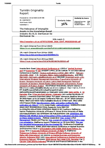 Elizabeth Sugiarto D, Turnitin (2018) Turnitin Elizabeth Sugiarto Dermawan SE., MSi., Ak. " The Relevance of Intangible Assets in The Knowledge Based Industry : The Case of Two Theory of Companies Listed in the Indonesia Stock Exchange 2014-2016". The Relevance of Intangible Assets in The Knowledge Based Industry : The Case of Two Theory of Companies Listed in the Indonesia Stock Exchange 2014-2016. ISSN 2623-3525 print 2623-3517 on-line