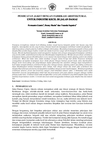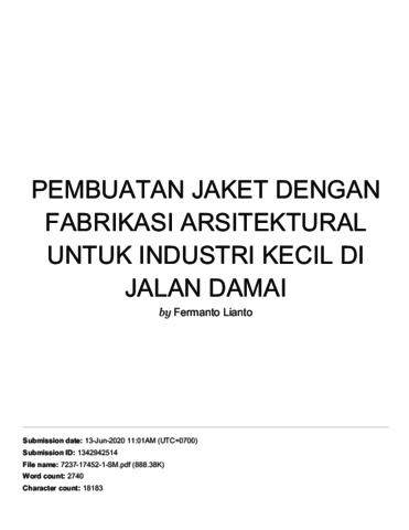 Lianto, Fermanto and Husin, Denny and Saputra, Yuanda (2019) Pembuatan Jaket dengan Fabrikasi Arsitektural untuk Industri Kecil di Jalan Damai. Jurnal Bakti Masyarakat Indonesia, 2 (2). pp. 117-125. ISSN 2621-0398