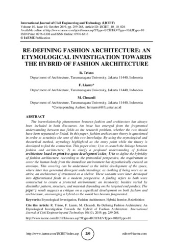 Trisno, Rudy and Lianto, Fermanto and Choandi, Mieke (2019) Re-Defining Fashion Architecture: An Etymological Investigation Towards the Hybrid of Fashion Architecture. International Journal of Civil Engineering and Technology (IJCIET), 10 (10). pp. 259-268. ISSN 0976-6316