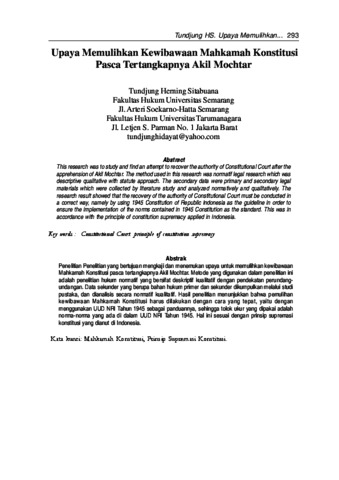 Herning Sitabuana, Tundjung (2014) Upaya Memulihkan Kewibawaan Mahkamah Konstitusi Pasca Tertangkapnya Akil Mokhtar. Jurnal Ius Quia Iustum, Terakreditasi oleh SK DIRJEN DIKTI NO. 56/DIKTI/Kep/2012, 21 (2). pp. 293-308. ISSN 0854-8498