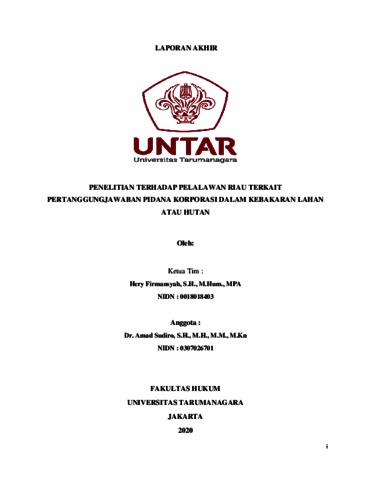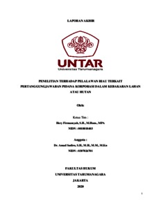 Sudiro, Amad (2020) PENELITIAN TERHADAP PELALAWAN RIAU TERKAIT PERTANGGUNGJAWABAN PIDANA KORPORASI DALAM KEBAKARAN LAHAN ATAU HUTAN. Fakultas Hukum Universitas Tarumanagara. (Unpublished)