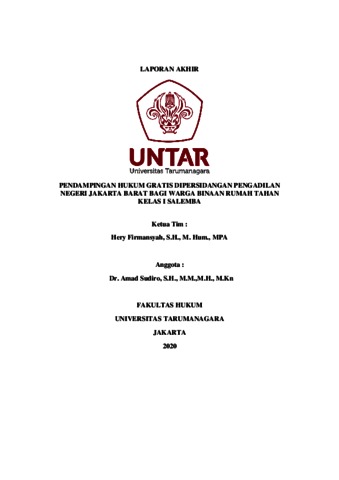 Sudiro, Amad (2020) PENDAMPINGAN HUKUM GRATIS DIPERSIDANGAN PENGADILAN NEGERI JAKARTA BARAT BAGI WARGA BINAAN RUMAH TAHAN KELAS I SALEMBA. Fakultas Hukum Universitas Tarumanagara. (Unpublished)