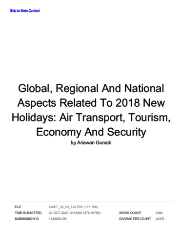 Gunadi, Ariawan (2018) Turnitin Global, Regional And National Aspects Related To 2018 New Holidays: Air Transport, Tourism, Economy And Security. IAEME.