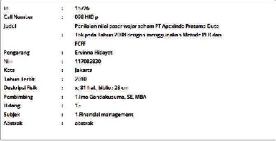 Hidayat, Ervinna (2010) Penilaian nilai pasar wajar saham PT Apexindo Pratama Duta Tbk pada Tahun 2008 dengan menggunakan Metode PER dan FCFF. Masters thesis, Universitas Tarumanagara.