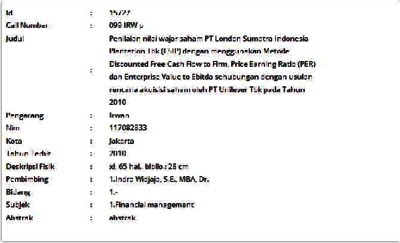 Irwan, Irwan (2010) Penilaian nilai wajar saham PT London Sumatra Indonesia Plantation Tbk (LSIP) dengan menggunakan Metode Discounted Free Cash Flow to Firm, Price Earning Ratio (PER) dan Enterprise Value to Ebitda sehubungan dengan usulan rencana akuisisi saham oleh PT Unilever Tbk pada Tahun 2010. Masters thesis, Universitas Tarumanagara.