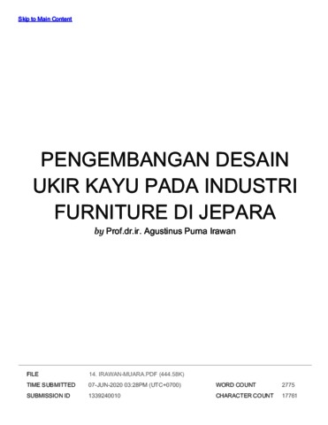Supriyatna, Eddy and Purna Irawan, Agustinus and Widya Mutiara, Maitri (2019) Turnitin : Pengembangan Desain Ukir Kayu Pada Industri Furniture di Jepara. Jurnal Muara Ilmu Sosial, Humaniora, dan Seni, 3 (2). ISSN 2579-6348