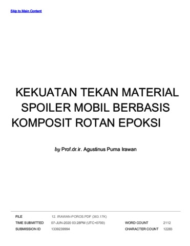 Purna Irawan, Agustinus and Adianto, adianto and Sukania, I Wayan (2018) Turnitin : Kekuatan Tekan Material Spoiler Mobil Berbasis Komposit Rotan Epoksi. Jurnal Poros, 16 (1). ISSN 1410-6841