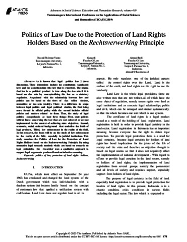 Gunardi, Gunardi (2019) Politics of Law Due to the Protection of Land Rights Holders Based on the Rechtsverwerking Principle. Tarumanagara International Conference on the Applications of Social Sciences and Humanities (TICASH 2019), 439. pp. 474-477.