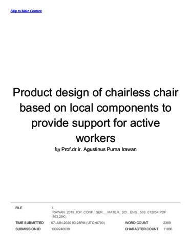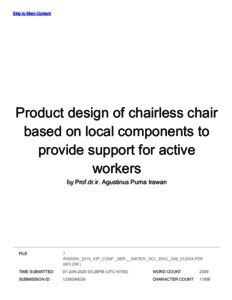Purna Irawan, Agustinus and Utama, Didi Widya and Affandi, E and Suteja, H (2019) Turnitin : Product design of chairless chair based on local components to provide support for active workers. TICATE 2018. ISSN 1757899X