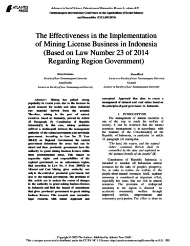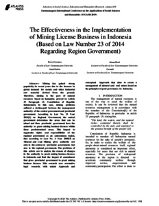 Jurnal The Effectiveness in the Implementation of Mining License Business in Indonesia (Based on Law Number 23 of 2014 Regarding Region Government.pdf Download (355kB) | Preview |