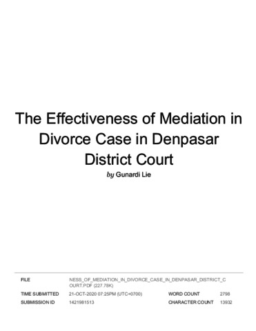 Gunardi, Gunardi (2019) Turnitin The Effectiveness of Mediation in Divorce Case in Denpasar District Court. Atlantis Press.