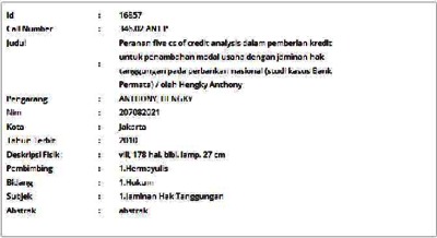 Anthony, Hengky (2010) Peranan five cs of credit analysis dalam pemberian kredit untuk penambahan modal usaha dengan jaminan hak tanggungan pada perbankan nasional (studi kasus Bank Permata). Masters thesis, Universitas Tarumanagara.