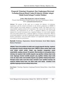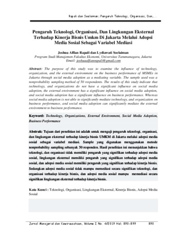 Rapali, Joshua Alfian and Soelaiman, Lydiawati Pengaruh Teknologi, Organisasi, Dan Lingkungan Eksternal Terhadap Kinerja Bisnis Umkm Di Jakarta Melalui Adopsi Media Sosial Sebagai Variabel Mediasi. Pengaruh Teknologi, Organisasi, Dan Lingkungan Eksternal Terhadap Kinerja Bisnis Umkm Di Jakarta Melalui Adopsi Media Sosial Sebagai Variabel Mediasi.