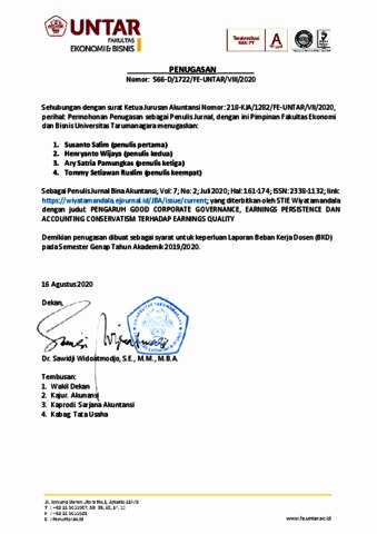 Salim, Susanto and Wijaya, Henryanto and Pamungkas, Ary Satria and Ruslim, Tommy Setiawan PENGARUH GOOD CORPORATE GOVERNANCE, EARNINGS PERSISTENCE DAN ACCOUNTING CONSERVATISM TERHADAP EARNINGS QUALITY. PENGARUH GOOD CORPORATE GOVERNANCE, EARNINGS PERSISTENCE DAN ACCOUNTING CONSERVATISM TERHADAP EARNINGS QUALITY.