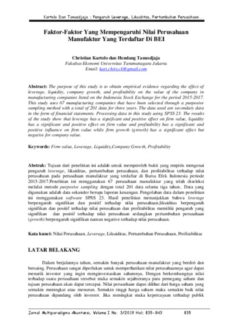 Kartolo, Christian and Tanusdjaja, Hendang Faktor-Faktor Yang Mempengaruhi Nilai Perusahaan Manufaktur Yang Terdaftar Di BEI. Faktor-Faktor Yang Mempengaruhi Nilai Perusahaan Manufaktur Yang Terdaftar Di BEI.