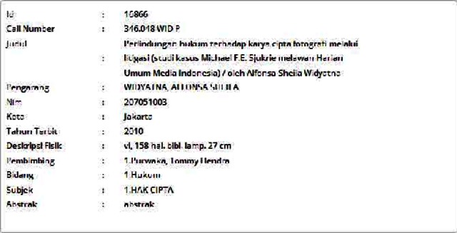 Sheila Widyatna, Alfonsa (2010) Perlindungan hukum terhadap karya cipta fotografi melalui litigasi (studi kasus Michael F.E. Sjukrie melawan Harian Umum Media Indonesia). Skripsi thesis, Universitas Tarumanagara.