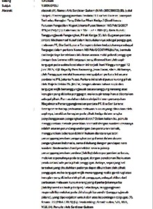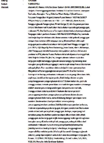 (A). Nama : Aris Sardister Gultom (NIM : 205050033) (B). Judul Skripsi : ?Pertanggungjawaban Perdata PT Eka Sari Lorena Transport Terhadap Kerugian Yang Diderita Pihak Ketiga.? (Studi kasus : Putusan Pengadilan Negeri Jakarta Pusat Nomor: 165/Pdt/G/2007/PN.Jkt.Pst).? (C). Halaman : ix + 102 + 27 + 2009 (D). Kata Kunci : Tanggungjawab Pengangkut, Pihak Ketiga (E). Isi : Gugatan perdata antara Mochammad Yusuf dalam kedudukannya sebagai penggugat, melawan PT, Eka Sari Lorena Tarnsport dalam kedudukannya sebagai Tergugat dalam perkara Nomor: 165 Pdt/G/2007/PN.Jkt.Pst, bermula dari terjadinya kecelakaan lalu lintas antara mobil pribadi penggugat dengan bus Lorena milik tergugat yang dikemudikan oleh supir tergugat pada waktu kecelakaan ini terjadi, hari Minggu tanggal 12 Juni 2005, di Jl. Raya By Pass Karawang, Jawa Barat, silam. Akibatnya, oleh Penggugat melalui kuasanya mengajukan perkara ini secara perdata ke PN. Jakarta Pusat. Perkara ini telah diputus kurang pihak oleh Majelis Hakim PN. Jkt.Pst, dengan alasan bahwa supir dan tergugat wajib bertanggungjawab secara tanggung renteng atas kerugian yang diderita penggugat, maka supir tetap harus disertakan sebagai pihak. Permasalahan dalam skripsi ini mempertanyakan ?Bagaimana Pertanggungjawaban perdata PT. Eka Sari Lorena Transport terhadap perbuatan melawan hukum yang dilakukan oleh supirnya, berakibat kerugian pada pihak ketiga dalam rangka penyelenggaraan pengangkutan darat.? Dalam kaitan itu, penulis menggunakan metode penelitian normatif dengan sumber utamanya adalah aturan perundang-undangan dan peraturan terkait, menggunakan beberapa doktrin hukum diantaranya teori pertanggungjawaban pengangkut yang dianut dalam sistem pengangkutan Indonesia, serta didukung dengan pendapat nara sumber. Berdasarkan hasil penelitian secara prinsip pertanggungjawaban perdata (liability) dalam pengertian terbatas, melekat sepenuhnya pada tergugat, dengan penekanan ?kekuatan pembuktian? ada pada pihak penggugat. Artinya, sepanjang hal tersebut yang dituduhkan padanya dapat dibuktikan oleh pihak penggugat. maka tergugat wajib menanggung resiko ganti rugi atas kerugian yang diderita oleh pihak penggugat, sebagai akibat dari perbuatan melawan hukum orang yang diperkerjakannya itu (liabilitybased on fault principle). Sebaliknya, tanggungjawab responsibility melekat pada diri si supir itu sendiri (tanggungjawab pidana), yang dipekerjakan untuk dan atas kepentingan tergugat. (F). Acuan : 27 (1964 ? 2009) (G). Pembimbing : Amad Sudiro, S.H., M.H., M.M. (H). Penulis : Aris Sardister Gultom