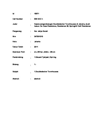 Gozali, Nur Jahja (2011) ajian pengembangan Doubledecker Townhouses di Jakarta, studi kasus: De Oaze Residence, Residence 28, Springhill Golf Residence. Masters thesis, UNIVERSITAS TARUMANAGARA.